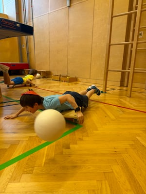 Am 18.12. wurde der Turnsaal kurzerhand zur Rennarena: Im Turnunterricht spielten die Kinder Mario Kart einmal ganz anders. Mit viel Kreativität entstand eine spannende Rennstrecke, auf der die Kinder mit Rollbrettern als Karts unterwegs waren.