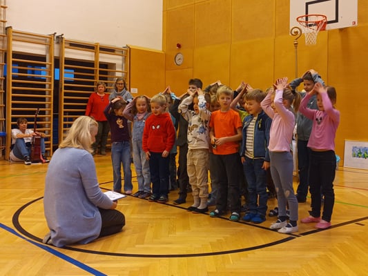 Zwei Klassen präsentierten ihm ein Gedicht und er überreichte jeder Pädagogin ein kleines Geschenk.